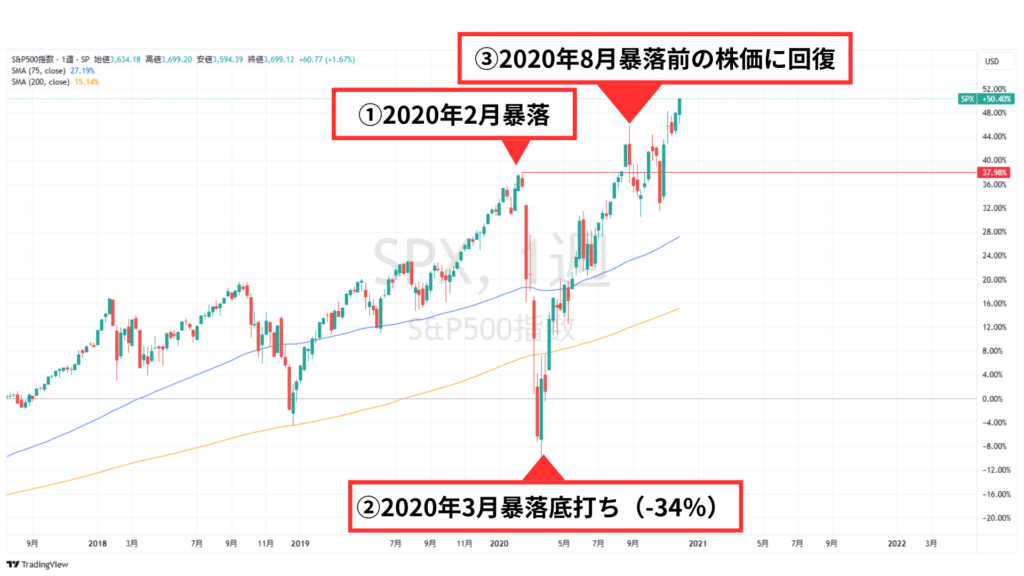 | コロナショック | 2020年 | -34%(2020年2月~3月) | 約5か月(2020年8月) |
